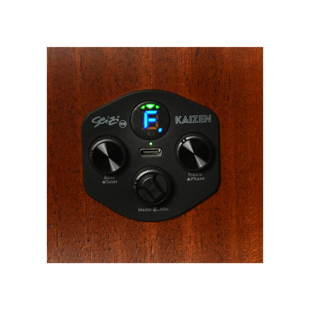 A grande novidade desse modelo é a presença do novo pré-amp Kaizen, palavra que em japonês representa o conceito de aprimoramento e evolução constante. O Seizi Kaizen inova ao oferecer uma bateria recarregável no lugar da tradicional bateria de 9V que equipa a imensa maioria dos violões. Com isso, você tem qualidade e controle aliados a uma grande economia ao longo dos anos. Evolua com a Seizi, evolua com Kaizen!!